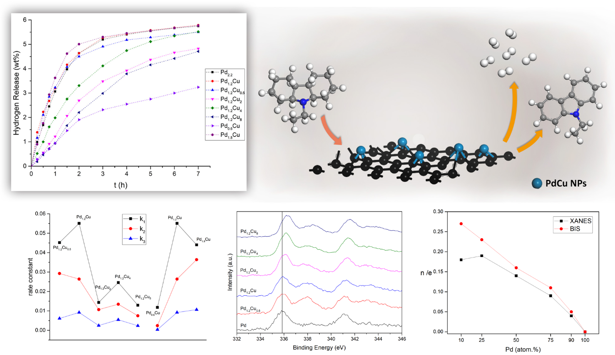 针对上述问题,西安交通大学化工学院绿色过程技术研究室(负责人:方涛教授)在前序研究的基础上,设计了一种简便温和的一锅法共还原制备得到了一系列不同配比的还原氧化石墨烯负载的双金属PdCu/rGO合金催化剂,其中Pd1.2Cu/rGO催化剂首次在453K下达到了脱氢终产物N-乙基咔唑100%的选择性,同时贵金属Pd的用量相对于该反应中常用的商业催化剂和其他课题组已报道的催化剂降低了60%以上。同时,本研究系统分析了共还原温度和金属负载量的变化对脱氢反应动力学的影响,结合一系列催化剂的表征,解释了双金属PdCu结构与性能间的构效关系。通过关联双金属PdCu纳米粒子的配比和电子结构,验证了不同配比催化剂的活性规律。这一工作首次建立了十二氢-N-乙基咔唑的宏观脱氢性能与活性组分微观电子结构间的关联,为相关有机液体储氢材料脱氢催化剂的设计提供了重要的指导和研究思路。