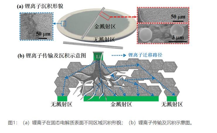 为此,科研人员通过将电解质两侧金属锂电极设计成互为垂直结构,构筑了非对称结构的固态电池(图1a),通过观察锂在电解质表面沉积状态来推断锂离子在电解质内部的传输过程。同时,在电解质表层中心区域溅射Au原子层,通过与未溅射Au原子层区域相比较,获取Au原子层对锂离子沉积的影响规律。研究结果表明,电解质表层的电子分布状态会直接影响电解质内锂离子的传输路径(图1b),使得来自电解质上表层的锂离子在电解质内呈发散状传输。进一步分析发现,在未溅射Au溅射区,锂离子沉积呈现为无规则区域富集分布状态(图1a中蓝框内左侧区域),将诱导锂枝晶生长进而诱发短路现象发生。而在溅射有Au原子层区域,锂离子沉积呈现为均匀球形颗粒分布状态(图1a中红框区域及蓝框内右侧区域),有效抑制了由于锂枝晶的生长带来的锂离子电池的安全隐患。该工作的开展为全固态电池界面性能优化及安全性能提升提供了理论与实验基础。