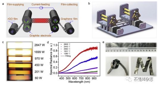 Figure 1. (a)连续电热示意图,(b)连续电热装置,(c)石墨烯膜电热过程中的照片,(d)不同温度的光谱图,(e)所制备的柔性石墨烯导热膜。