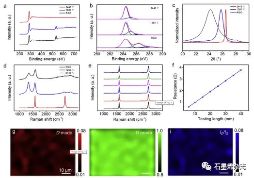 Figure 3.不同电热温度热处理石墨烯膜的(a,b)XPS、(c)XRD、(d)Raman表征;(e)石墨烯膜不同位置的拉曼光谱,间隔距离为1cm;(f)石墨烯膜电阻与测试长度的关系,表明制备的石墨烯膜宏观尺寸均匀;(g-i)石墨烯膜的拉曼成像扫描,证明石墨烯膜微观尺寸结构均匀。